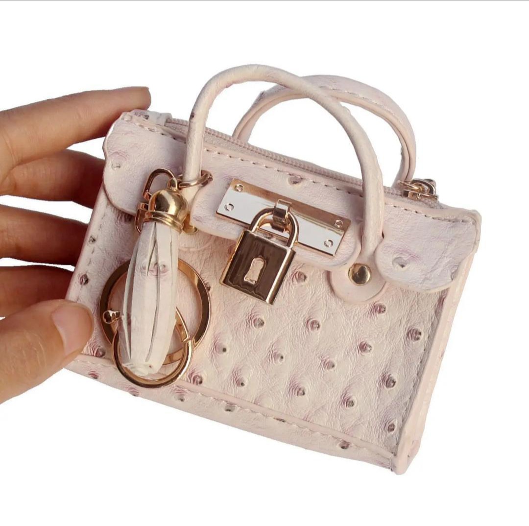 Μικρό εκρού μπρελόκ σε σχήμα τσάντας, με υφή τύπου δέρματος, μεταλλικό κούμπωμα και διακοσμητική φούντα. Ιδανικό για κλειδιά ή ως αξεσουάρ.