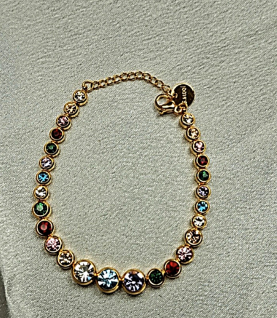 Λεπτεπίλεπτο βραχιόλι σε χρυσό τόνο, διακοσμημένο με λαμπερές πολύχρωμες λεπτομέρειες. Ένα κόσμημα που ξεχωρίζει και φοριέται εύκολα μόνο του ή σε layering.