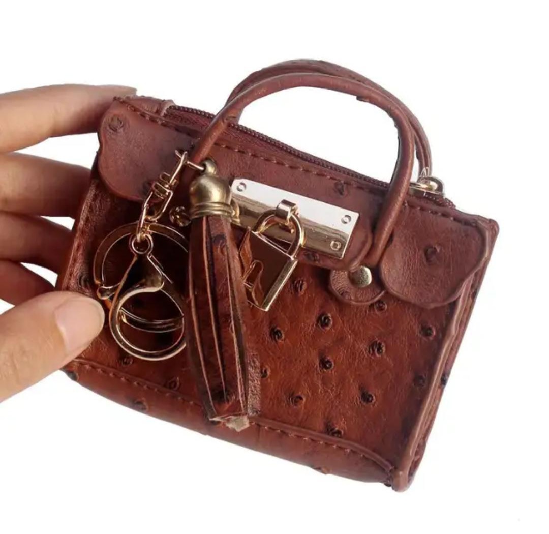 Μικρό Καφέ μπρελόκ σε σχήμα τσάντας, με υφή τύπου δέρματος, μεταλλικό κούμπωμα και διακοσμητική φούντα. Ιδανικό για κλειδιά ή ως αξεσουάρ.