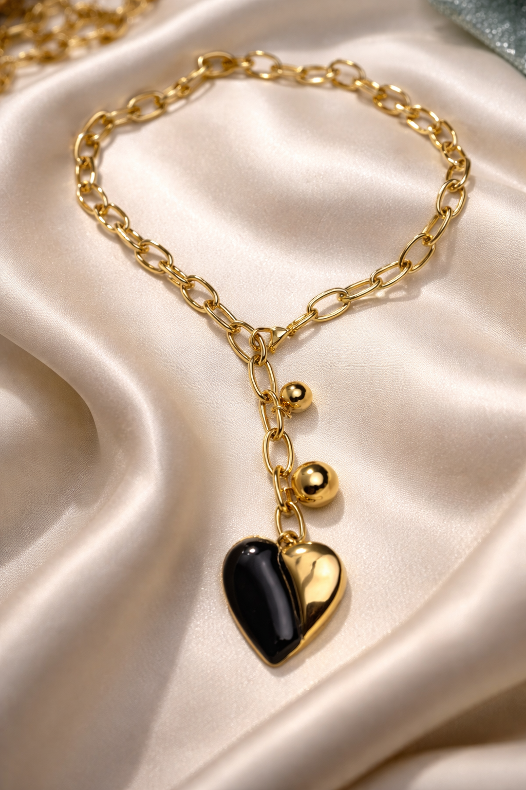Χρυσό κολιέ αλυσίδα με κομψό μενταγιόν καρδιά, σε διχρωμία μαύρου και χρυσού, για μοντέρνο και elegant στυλ.