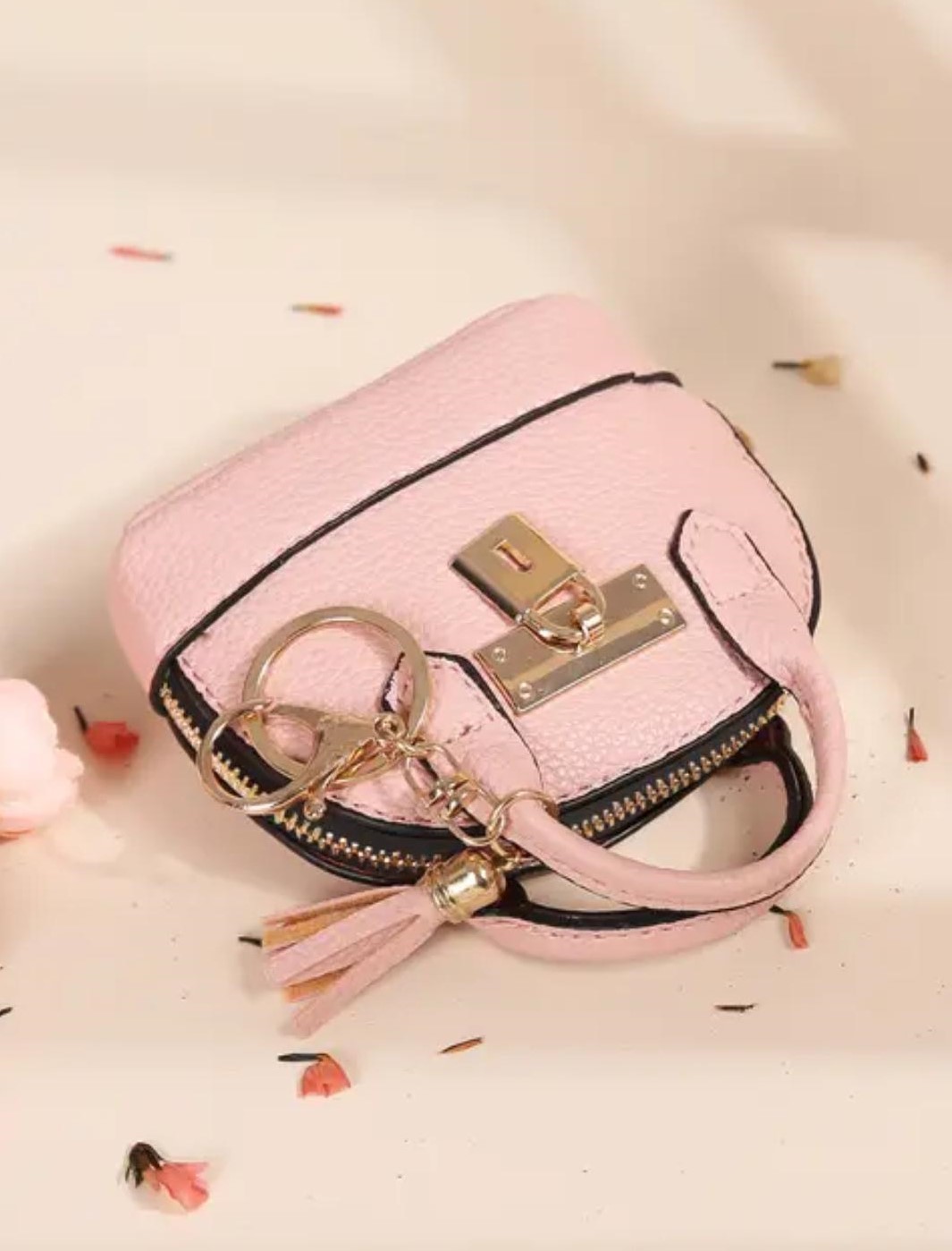Κομψό mini τσαντάκι σε ροζ χρώμα, ιδανικό ως μπρελόκ ή διακοσμητικό αξεσουάρ για τσάντα. Διαθέτει κοντό χερούλι, φερμουάρ και μεταλλικό διακοσμητικό κλείδωμα σε σχήμα λουκέτου. Συνοδεύεται από μεταλλικό κρίκο και φουντίτσα. Ιδανικό για δώρο, για κλειδιά ή για να δώσει στυλ σε κάθε τσάντα.