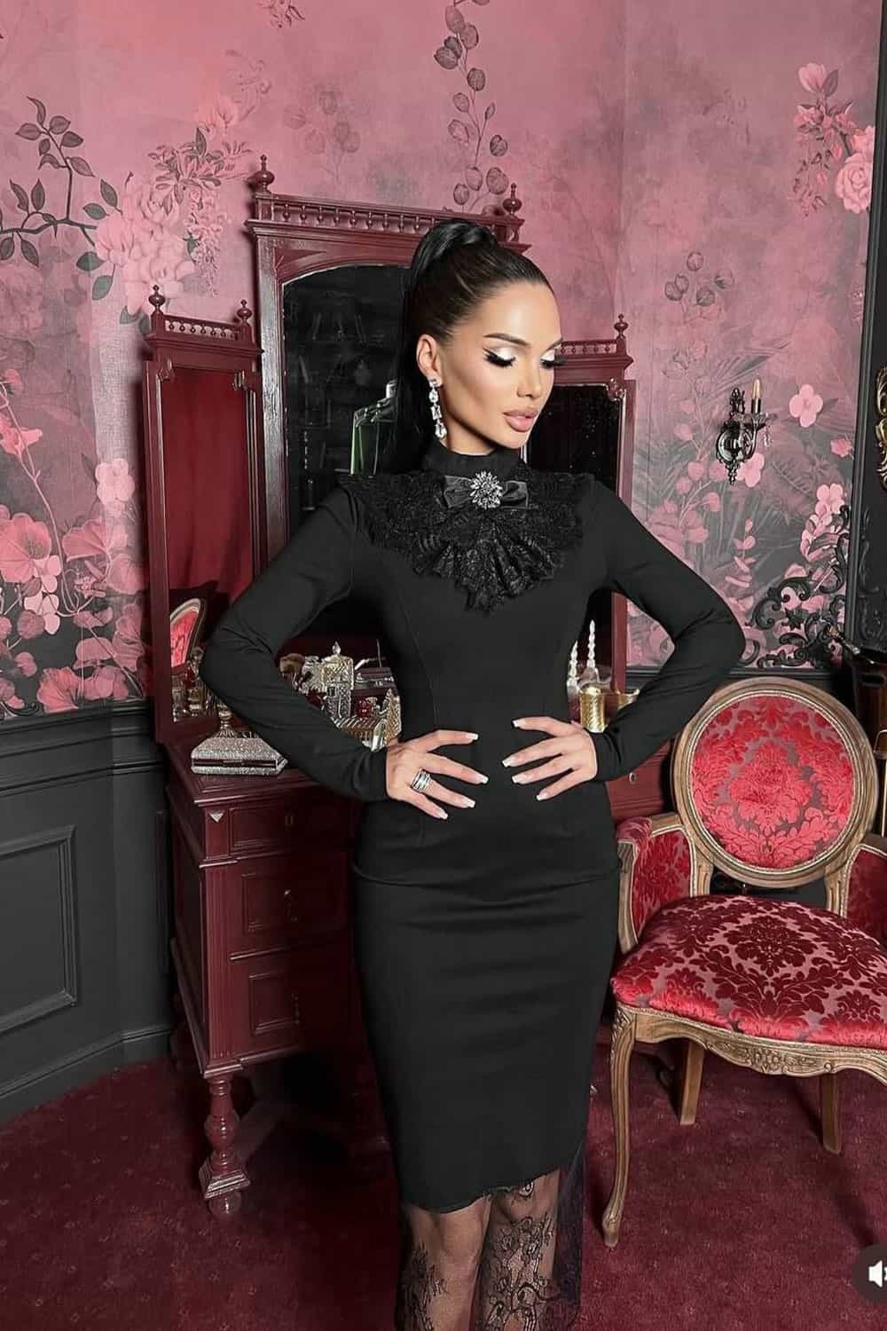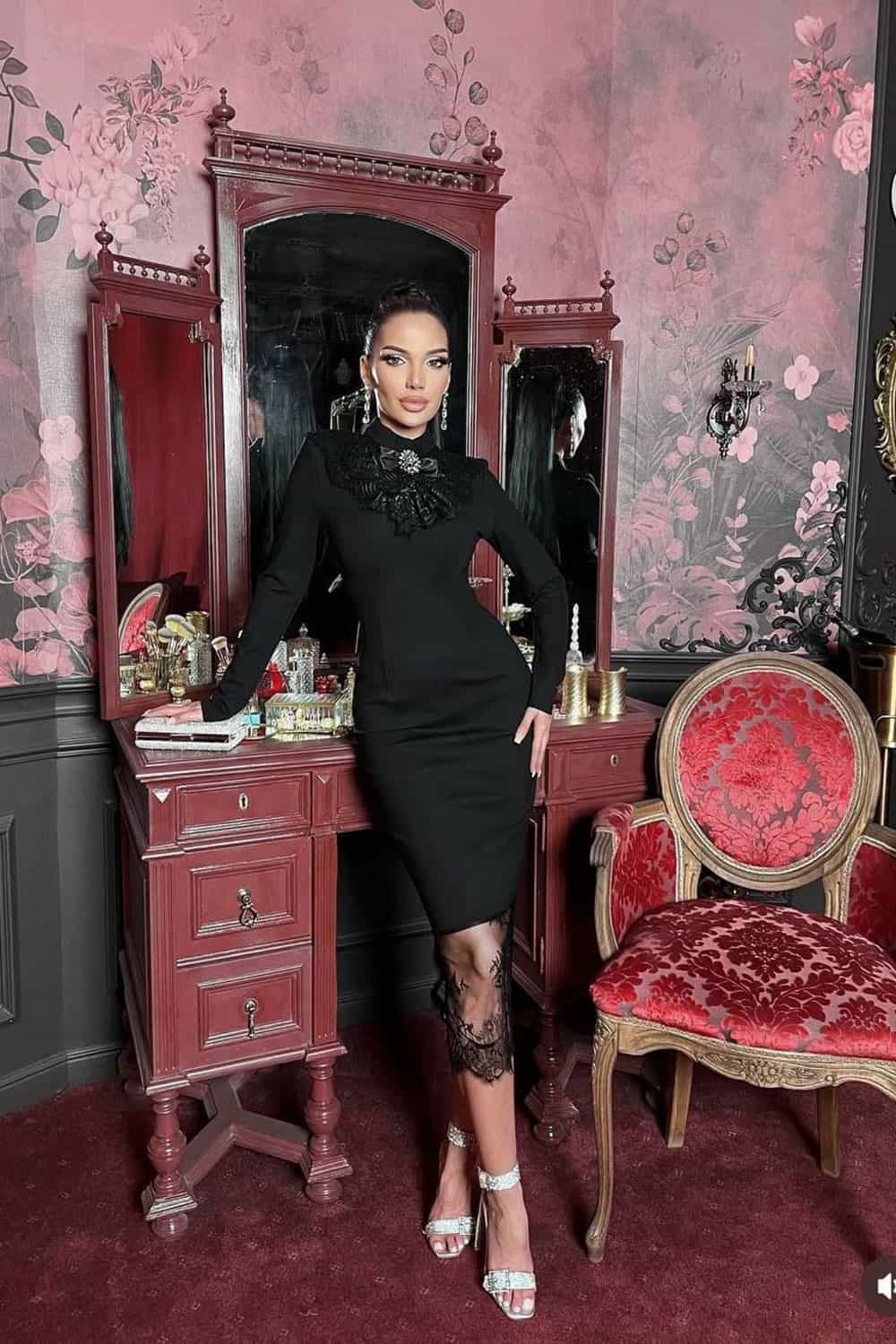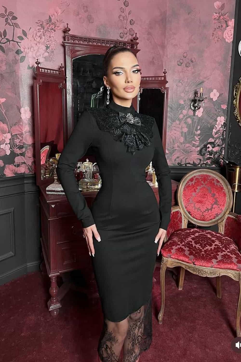 Μαύρο, εφαρμοστό φόρεμα midi. Έχει μακριά, στενά μανίκια. Στη βάση του λαιμού υπάρχει δαντέλα με καρφίτσα στο κέντρο. Αυτό δίνει μια αίσθηση βικτοριανού στυλ . Στο κάτω μέρος έχει τούλι με σχέδια, η οποία προσδίδει διαφάνεια και ιδιαίτερη υφή στο τελείωμα. Είναι ένα πολύ κομψό φόρεμα, που συνδυάζει την κλασική εφαρμοστή γραμμή με ρομαντικές και σκοτεινές (dark romance) λεπτομέρειες.