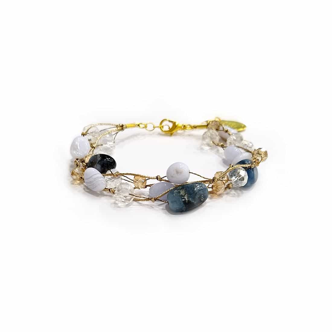 Το Precious Beads Triple Bracelet είναι ένα εντυπωσιακό χειροποίητο βραχιόλι που συνδυάζει την κομψότητα με τη γήινη ομορφιά των φυσικών λίθων. Αποτελείται από τριπλή σειρά χρυσών νημάτων, διακοσμημένα με μοναδικές χάντρες σε αποχρώσεις του μπλε, του λευκού και του διαφανούς – σαν να αιχμαλωτίζουν τη θάλασσα, τα σύννεφα και το φως.